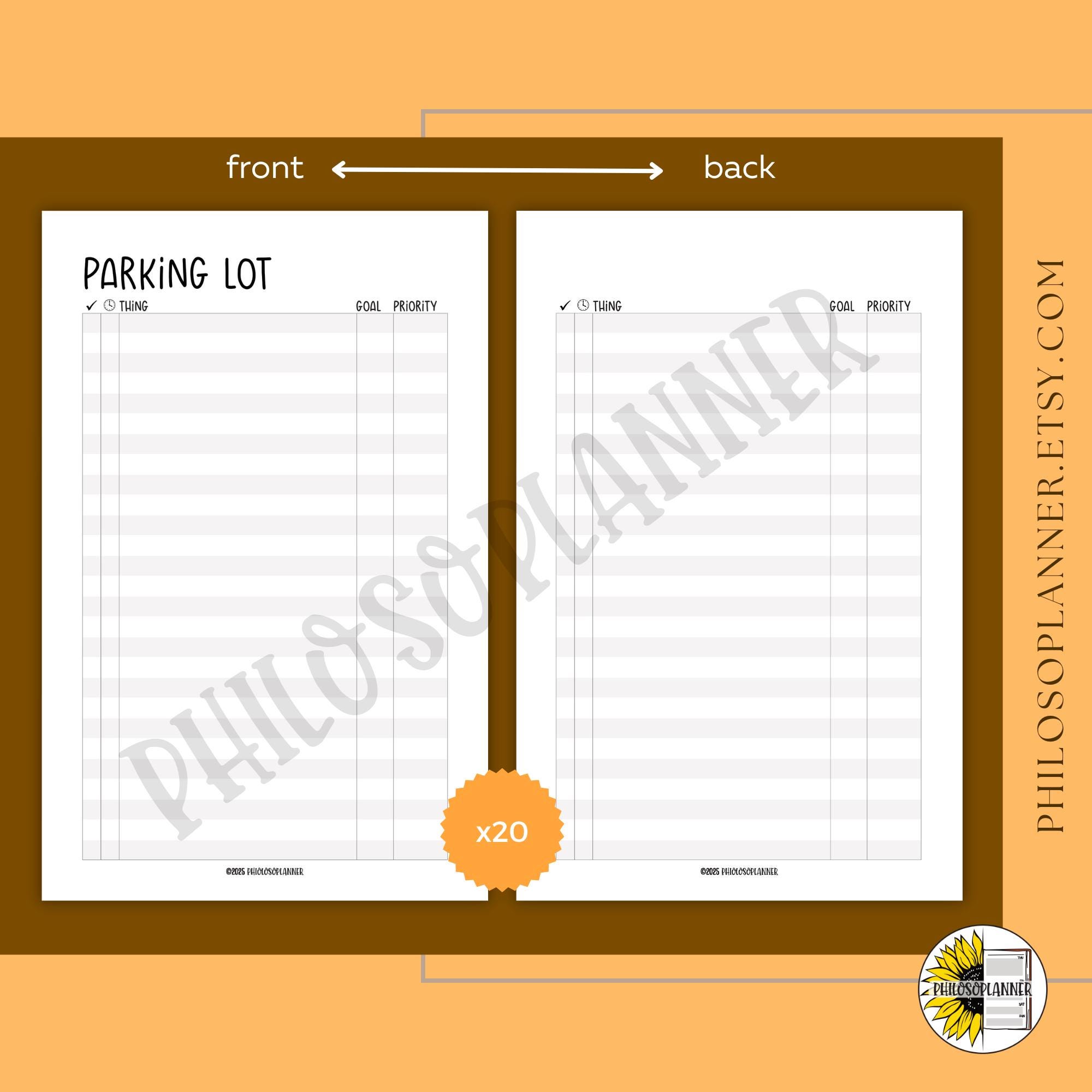 - 20 double-sided physical planner inserts with parking lot layout on both sides