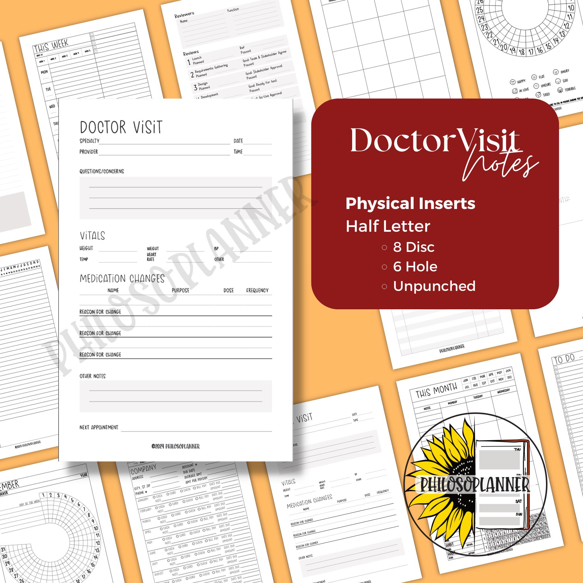 Doctor visit notes planner inserts help you capture important information before, during, and after medical appointments so nothing gets lost or forgotten. This is a physical product, not a digital download, designed for half letter discbound planners and health binders.