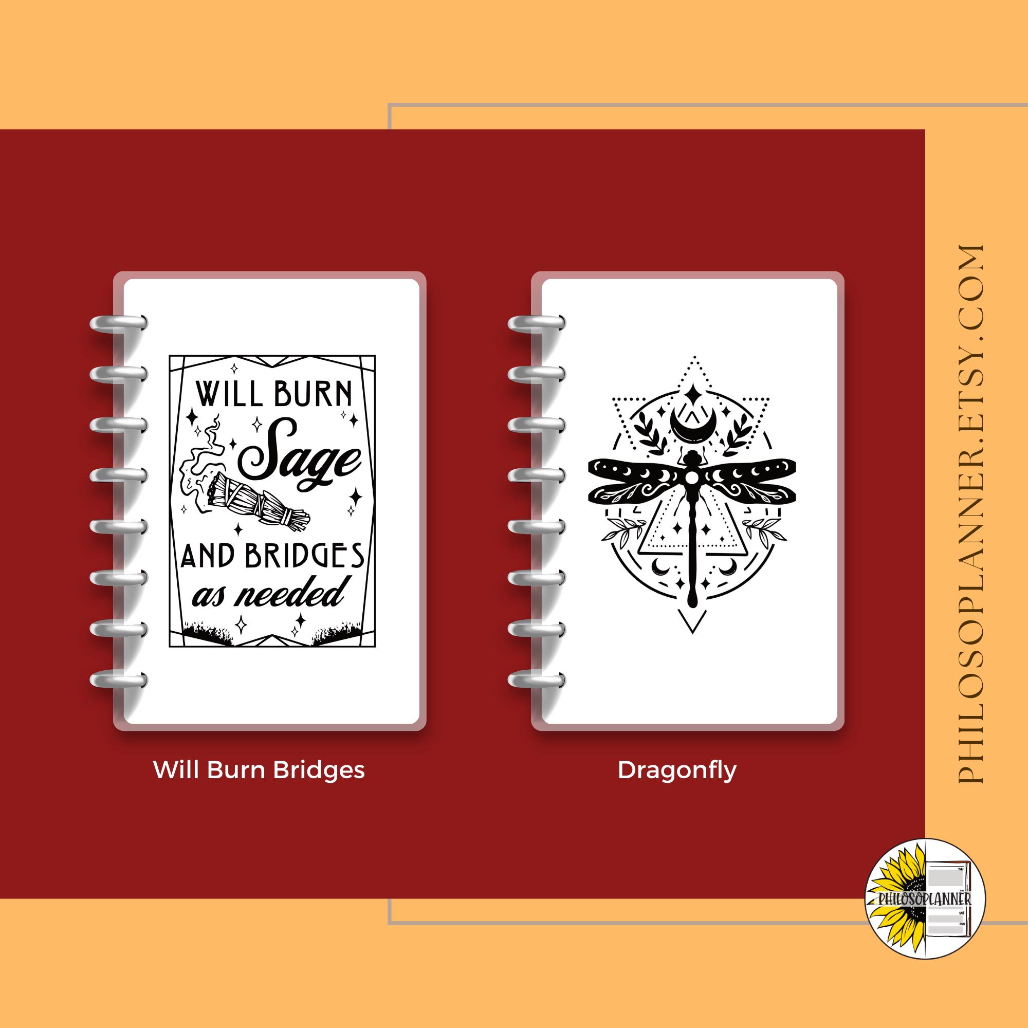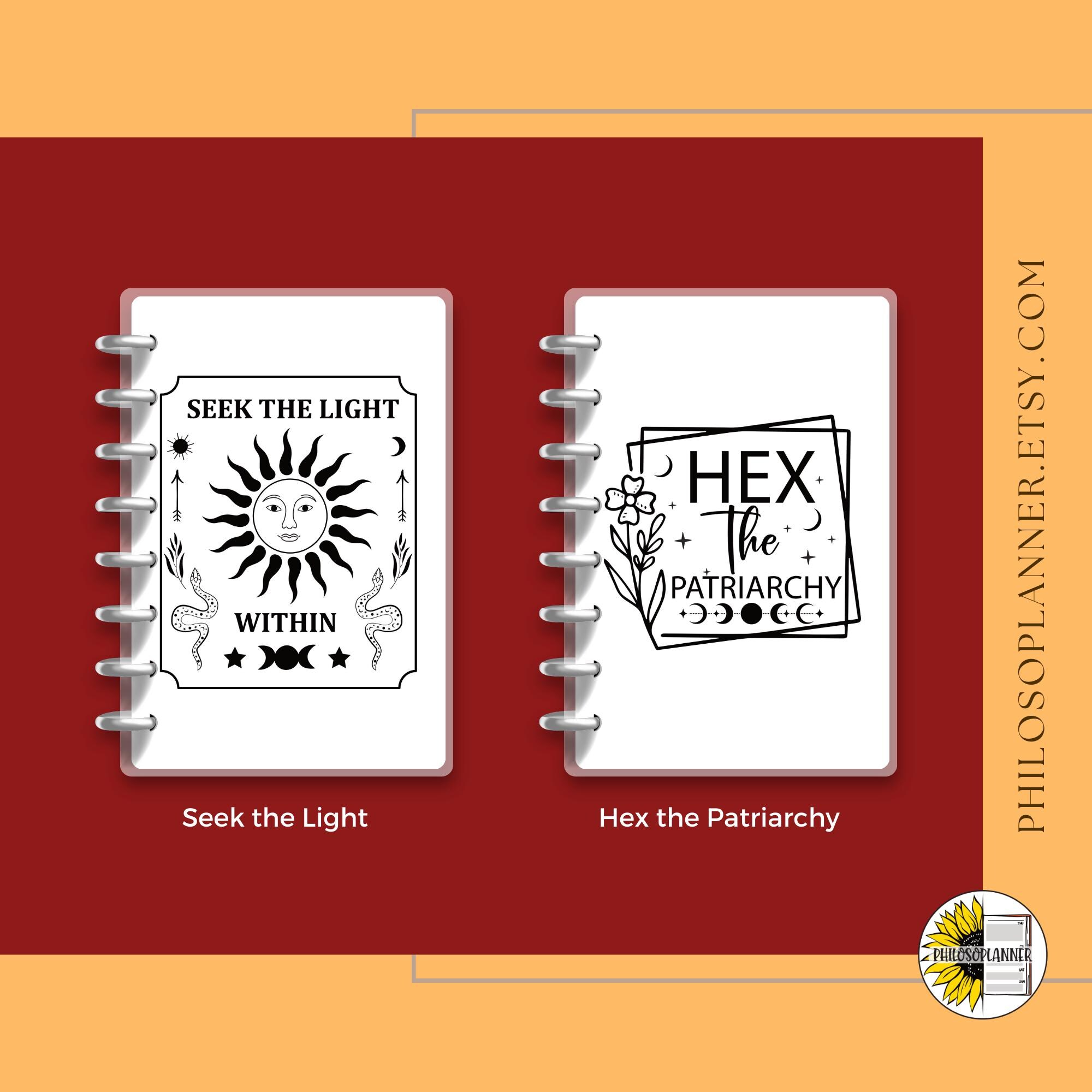 This witchy planner cover set blends gothic planner cover aesthetics, occult planner art, and tarot style cover imagery into a physical, ready to use discbound cover set. Designs include moon phase cover illustrations, feminist planner statements, pagan planner cover symbolism, and crystal witch cover art, all printed in crisp black and white for maximum contrast and timeless style.