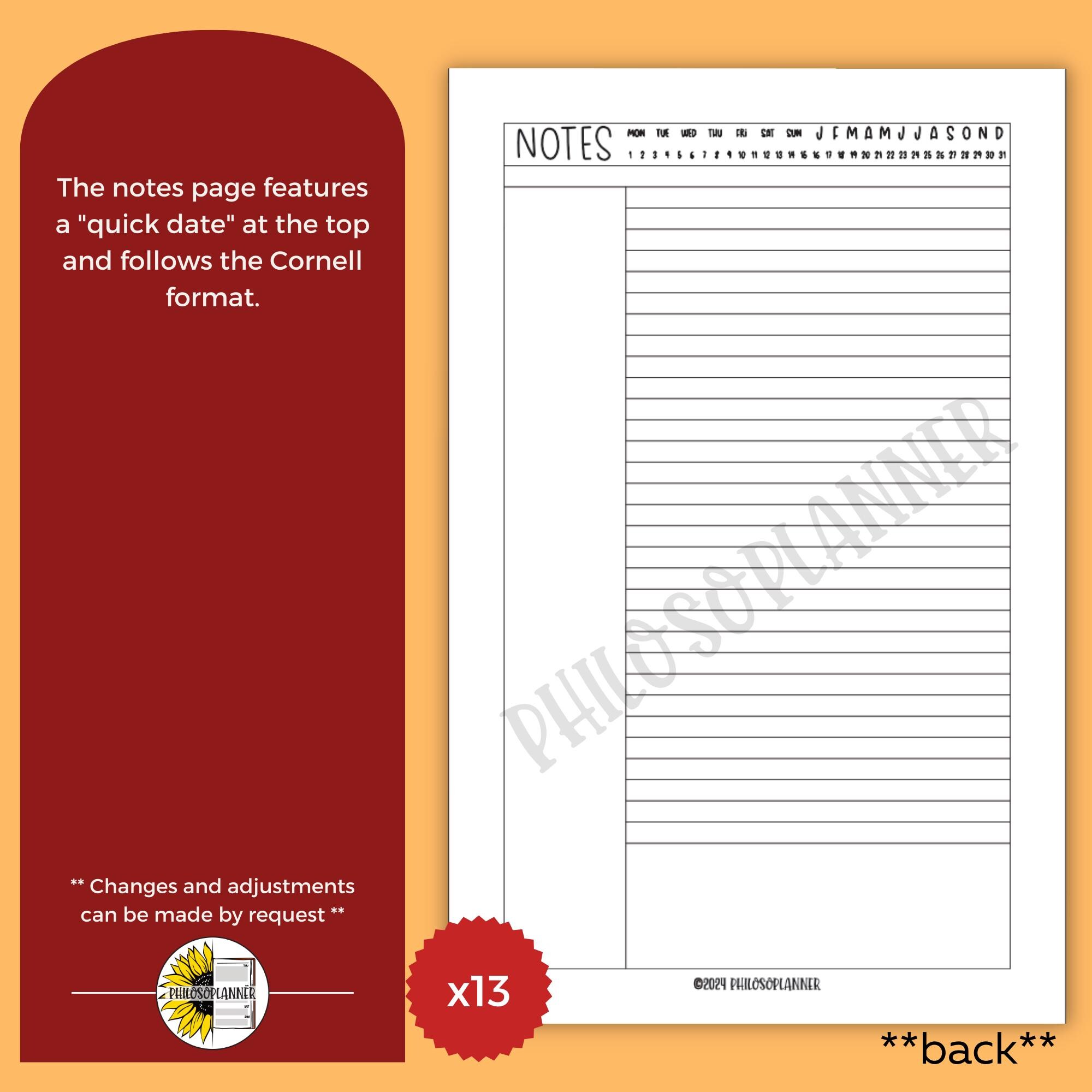 The notes page follows the Cornell method with a cue column, writing space, and summary space. The quick date at the top allows fast indexing without clutter. These inserts are ideal for task tracking, work planning, personal scheduling, study organization, and neurodivergent friendly weekly rhythm building.