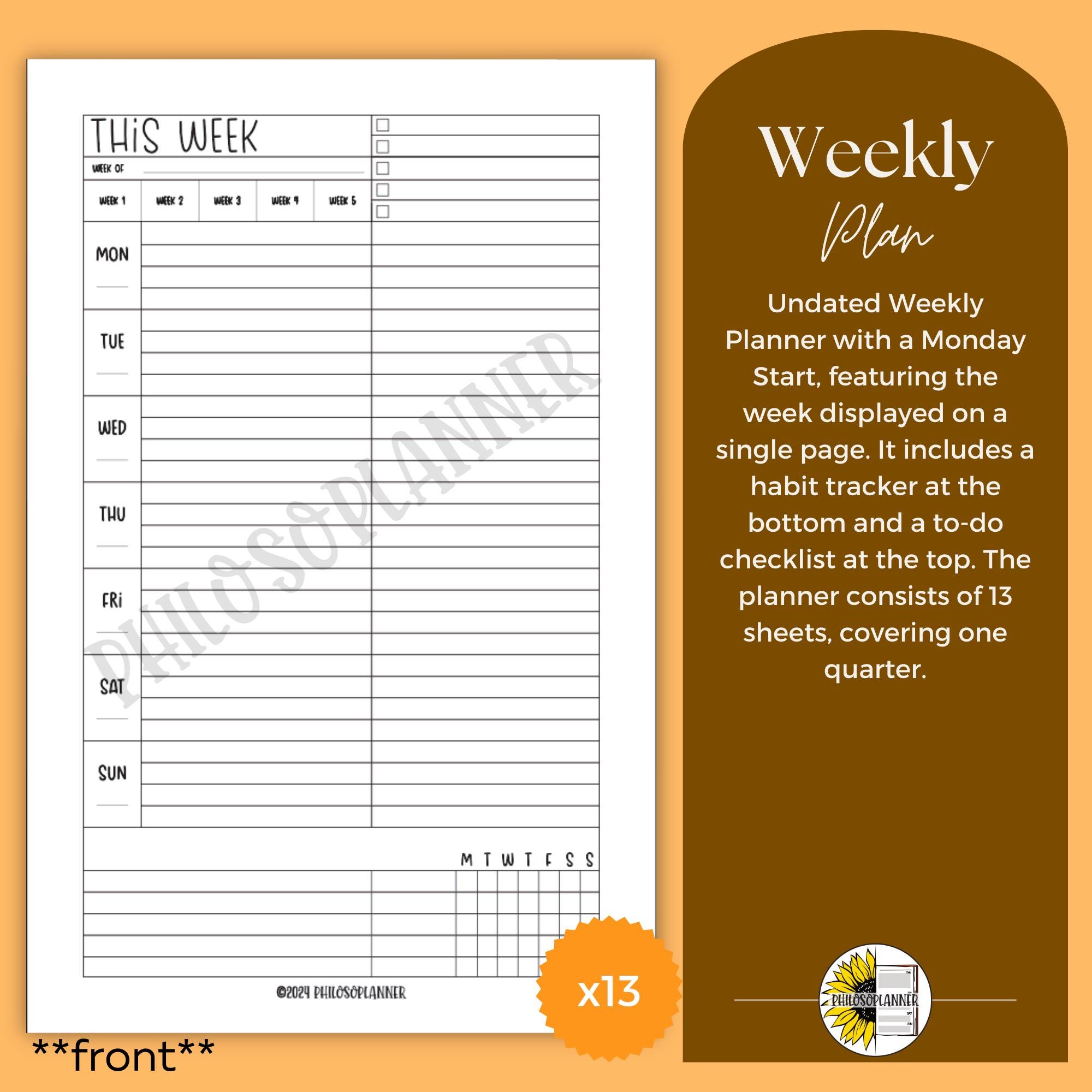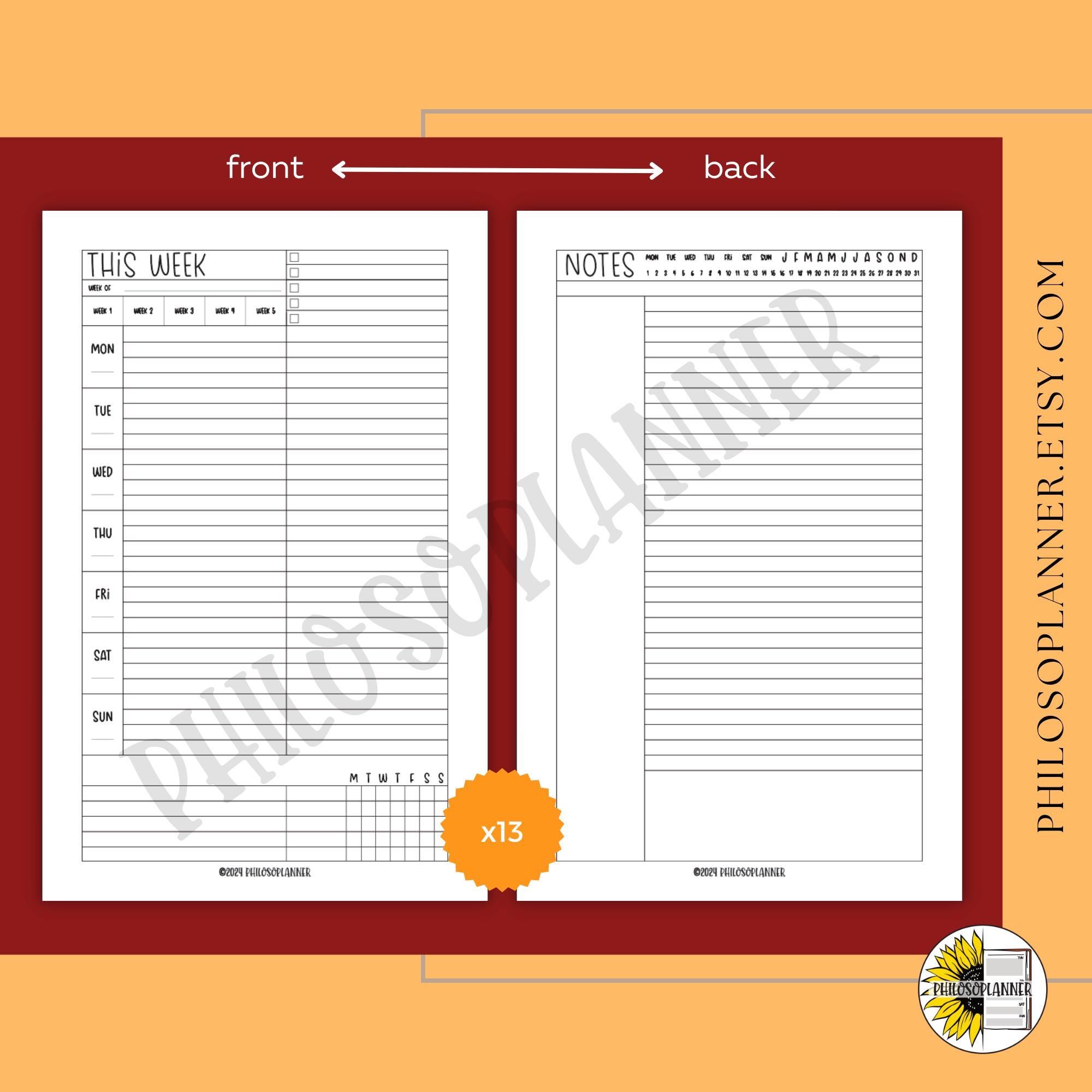This weekly layout is printed on high quality paper and ready to help you plan one quarter at a time. Each set includes thirteen double sided sheets, giving you thirteen weekly spreads. The front side is your weekly plan page, while the back features a notes page with a quick date section so you can reference the month and day at a glance. The design is clean, approachable, and easy to customize with your own stickers, highlighters, and color coding.