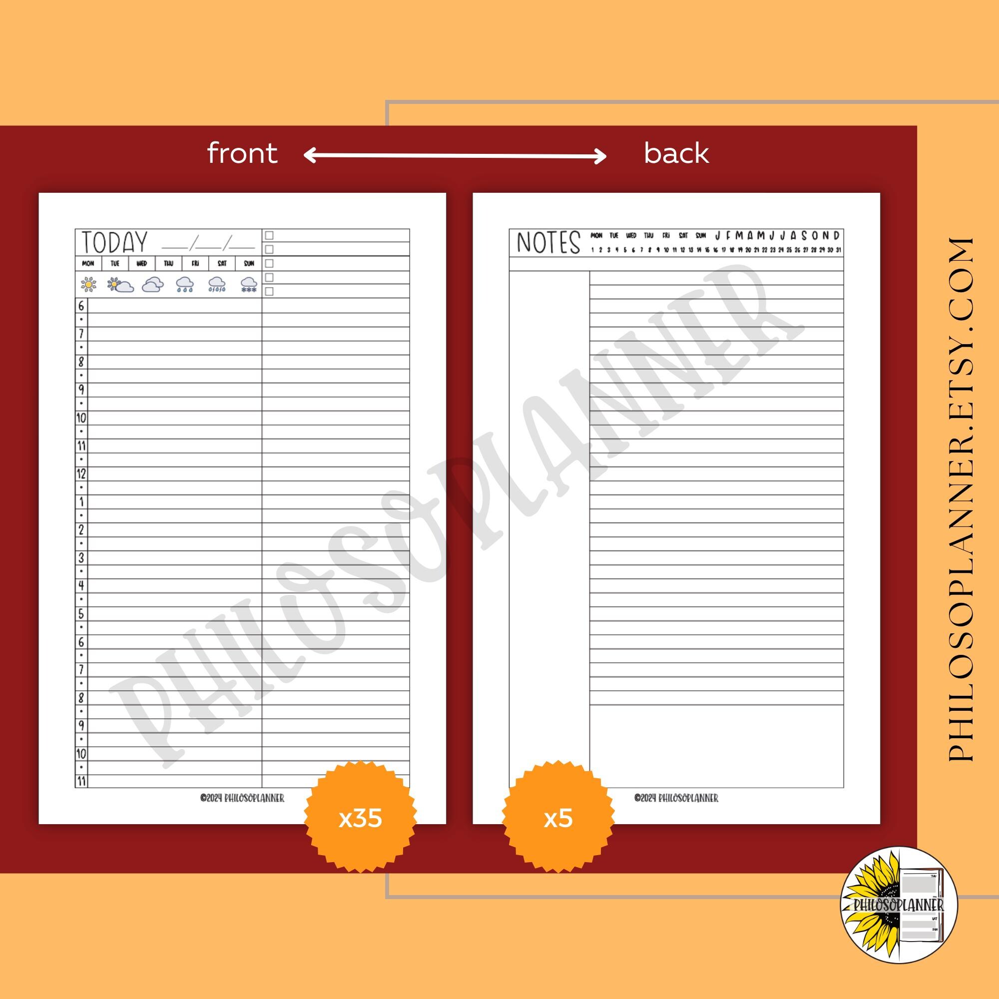 - Half letter daily planner insert set with 35 undated pages and 5 coordinating Cornell style notes pages